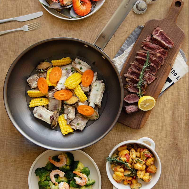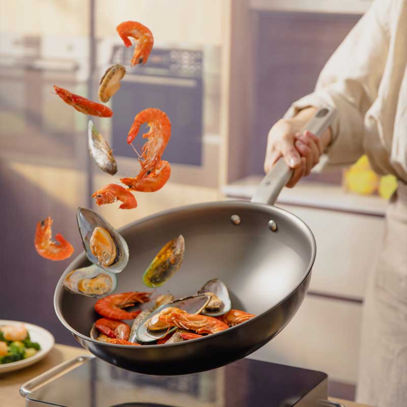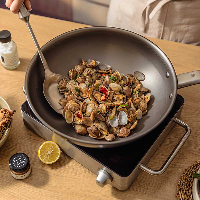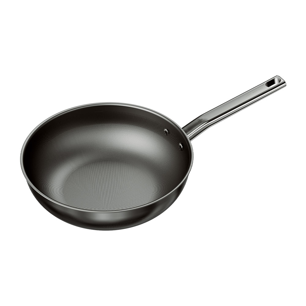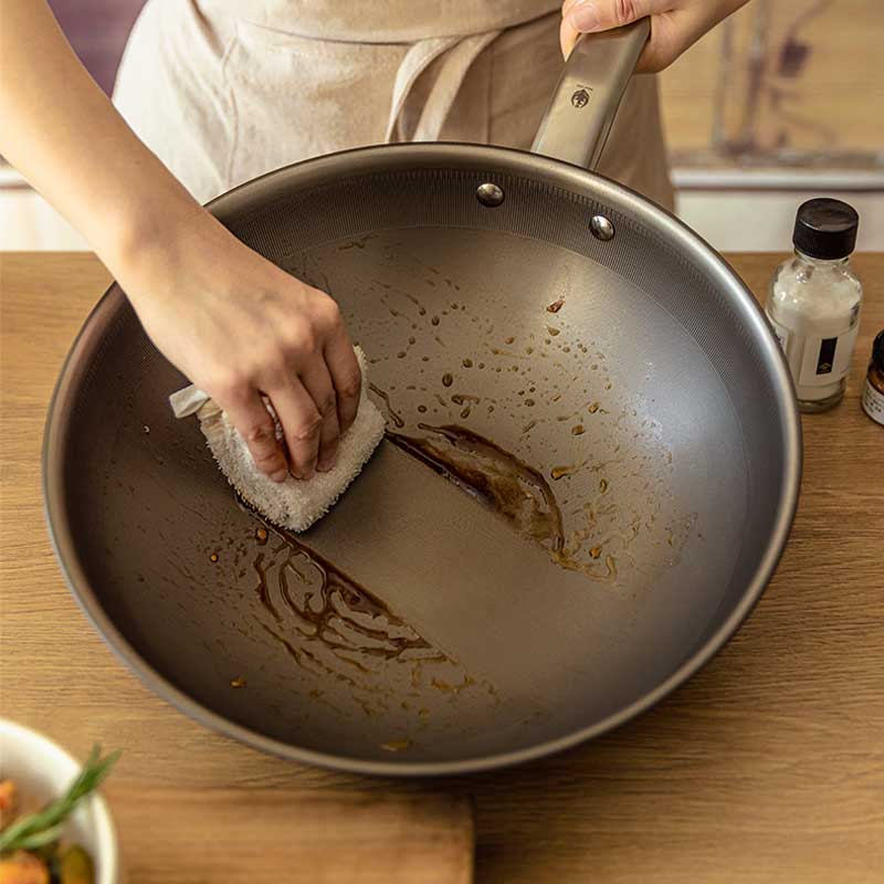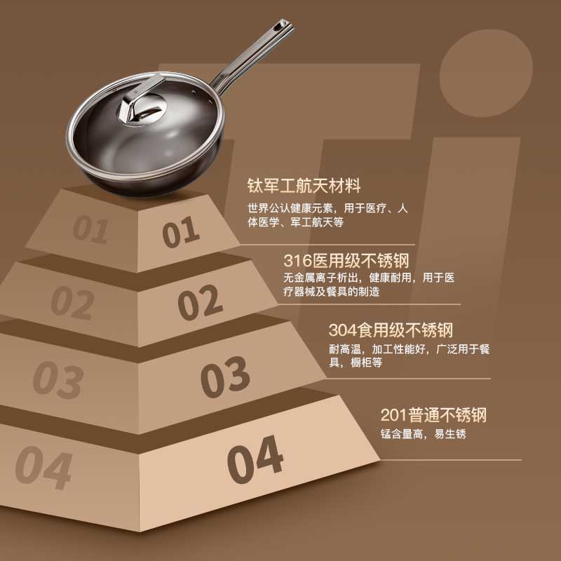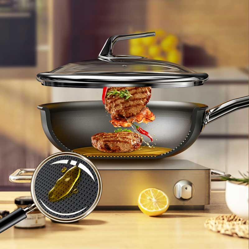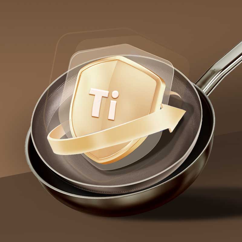 在钛材料表面精雕超10万个超密点阵,形成超薄抗粘油膜。